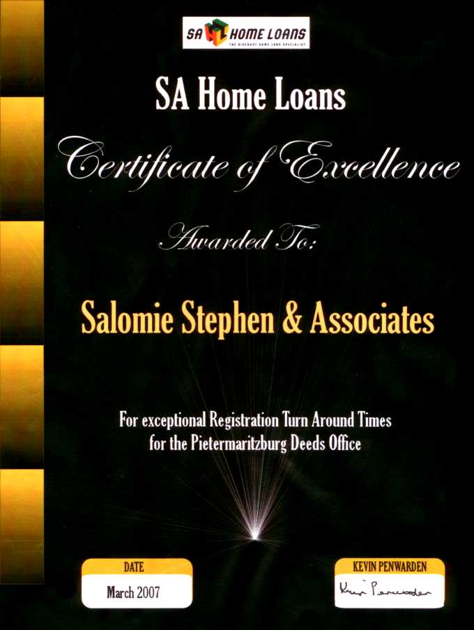 Salomie Stephen & Associates was awarded the prestigious SA Home Loan Certificate of Excellence for their exceptional registration turn-around times.